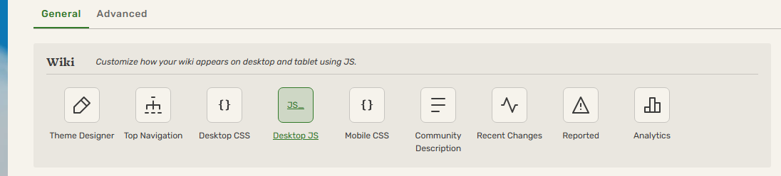 AdminDashboard JS-Button adds a button with a link to MediaWiki:Common.js (Desktop JavaScript) to the Admin Dashboard . It will be added to the Wiki section next to desktop CSS, and it is a quick access to desktop JS.