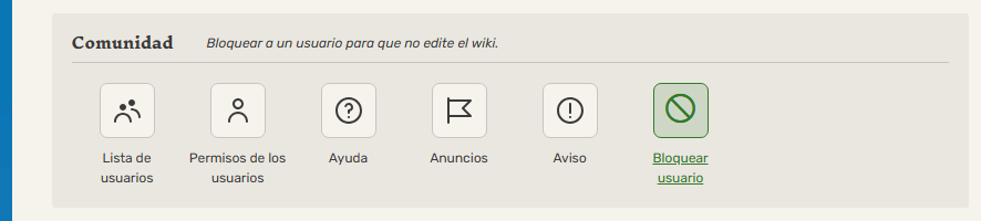 AdminDashboard block añade un botón con un enlace a Special:Block (en español redirige a Especial:Bloquear) al Panel de administración . Se añadirá a la sección Comunidad, y es un acceso rápido a herramientas para manejar bloqueos de usuario.