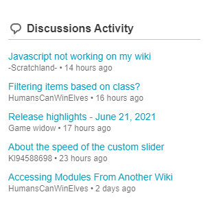 DiscussionsRailModule adds a rail module for Discussions to the rail, listing a feed of discussions posts for the wiki. The script offers the same configuration options.