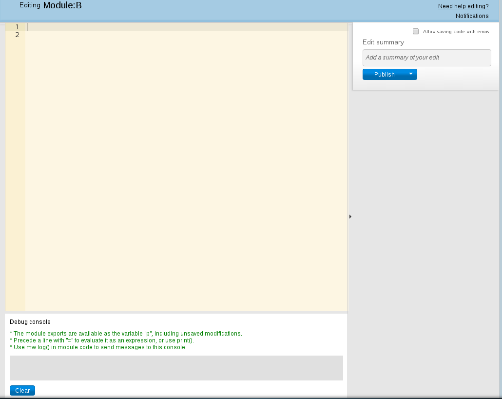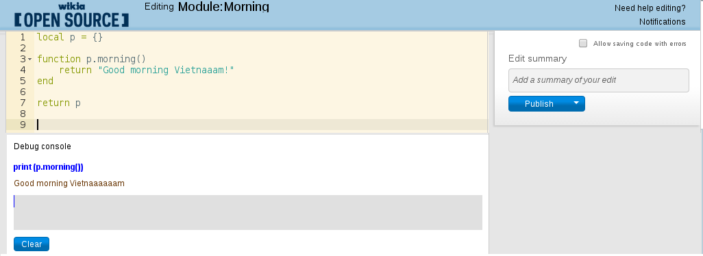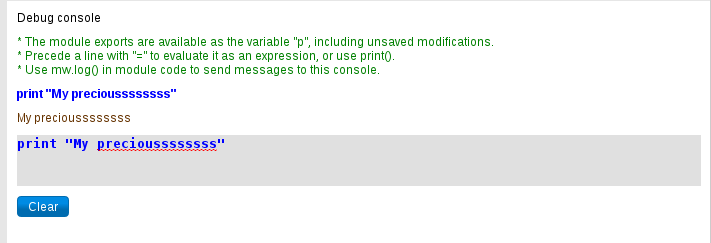 This helps to debug one or more modules without having to leave the current page and without having to save a page. A good introduction for Lua is available in Wikiversity.[1]