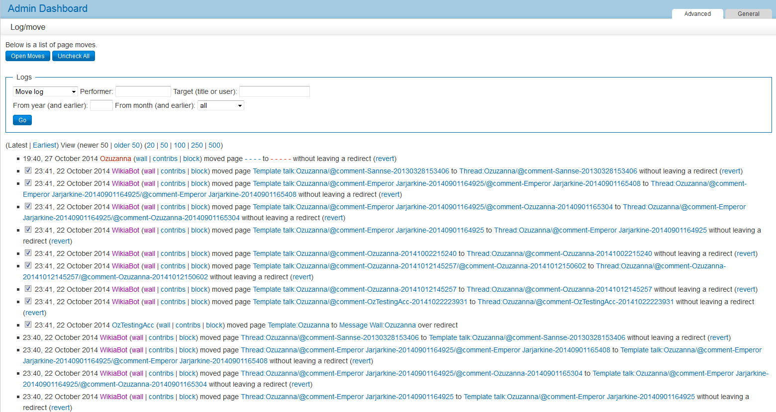 When the "Open Moves" button is pressed, all lines with the checkboxes checked will open the "revert" links in new separate tabs ready to revert them to their old page names.